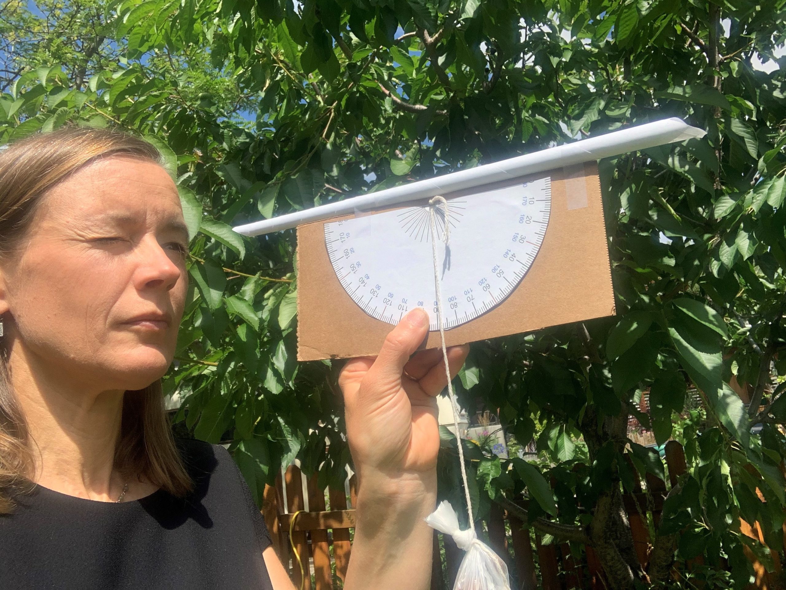 - Staple or tape (must be strong) the knotted end of the string to the centre of the protractor.