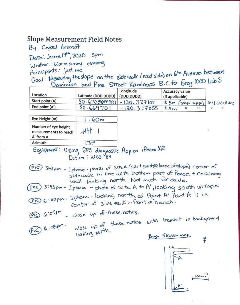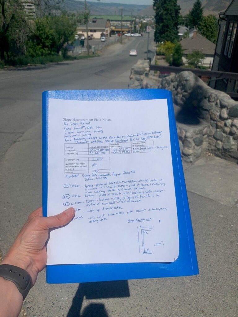 You will gather your own field measurements at a location of your choosing, and learn the basics of taking high quality field notes to support your field measurements. Then you will input your field measurements into Google Earth (Web) to help calculate the slope you observed in the field. Please pay special attention to the requirements for good note taking, your mark will reflect your ability!